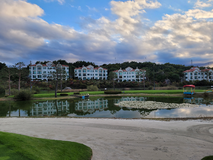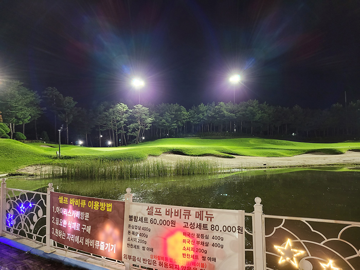 각홀마다 넓은 페어웨이에 예쁜 호수가 있고, 리조트 숙소의 멋진 모습도 있으며, 저녁에는 그린옆에서 삼겹살을 구어서 먹을 수 있는 편의도 제공해 주어 멋있는 추억의 장소가 되지요.